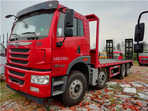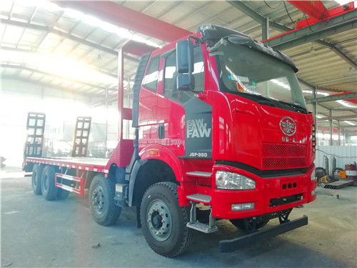 解放前四后八平板运输车,整车长:11380×2500×3560,平板长8米。8-10mm防滑花纹板,双簧爬梯,简易支脚拉35吨及35吨以下的不可拆卸的工程机械运输车,像挖掘机,装载机,收割机等机械。