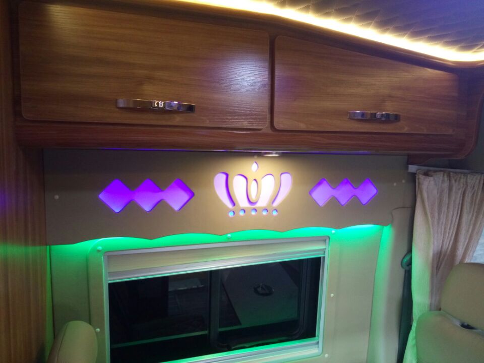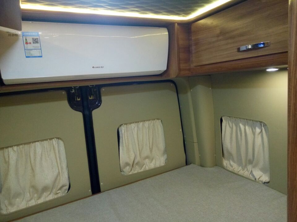车内家具:复合地板(防潮处理)、后置双人床(或上下铺)、卡座沙发(带升降餐桌,可变床)、时尚布艺遮阳窗帘、吊柜储物柜组合。
