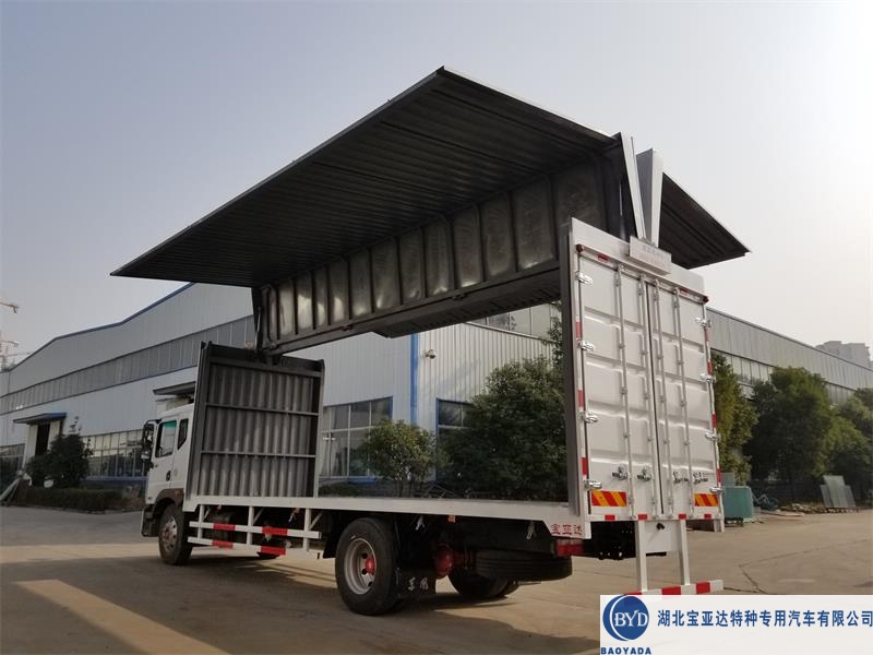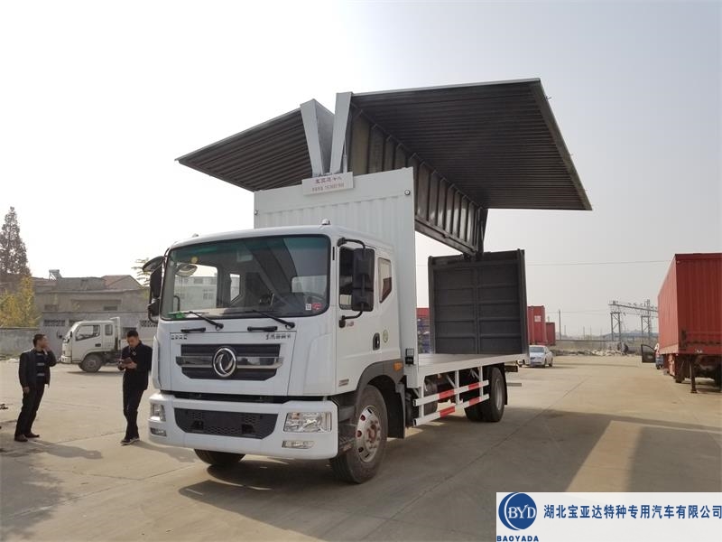东风多利卡7米6翼展车车厢配置:车厢结构可选择瓦楞板、铝合金波纹板、彩钢板三种结构,这三种结构工艺不一样,所以价格也不一样。最常见的还是瓦楞板结构,因为价格便宜,结实耐用,很受全国客户的喜爱。7米7展翼车采用3mm厚花纹板,侧板1.2mm厚瓦楞板,纵梁120#槽钢,横梁80#槽钢,边板120#槽钢,前后龙门骨架及顶部大梁全部使用6mm厚高锰钢,两边侧板可开启90度,后门双开门,车厢顶部方管骨架带镀锌板,最外层有防水雨布,飞翼车有着防水,防晒,防尘,防盗,上下货物方便快捷,节省人工的优点。在此热烈欢迎全国各地的飞翼车用户及老总来我公司实地考察指导。湖北宝亚达特种专用汽车位于湖北省襄阳市高新区二汽基地,和东风多利卡底盘大库以及市场厂区相隔2公里,湖北宝亚达国内首家自主研发制造飞翼车企业,配套与国内所有品牌卡车主机厂,品质求共存,服务结识天下友!