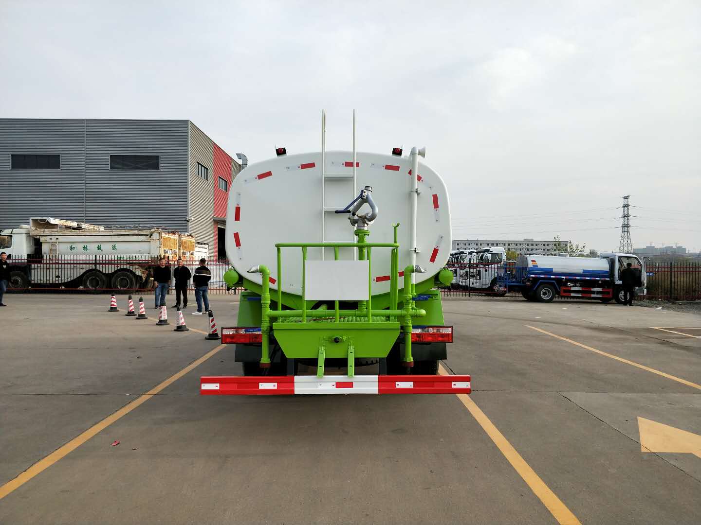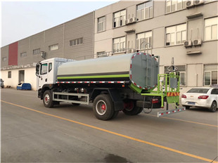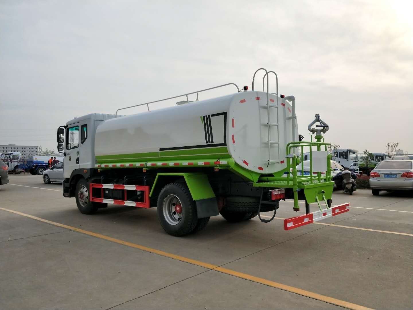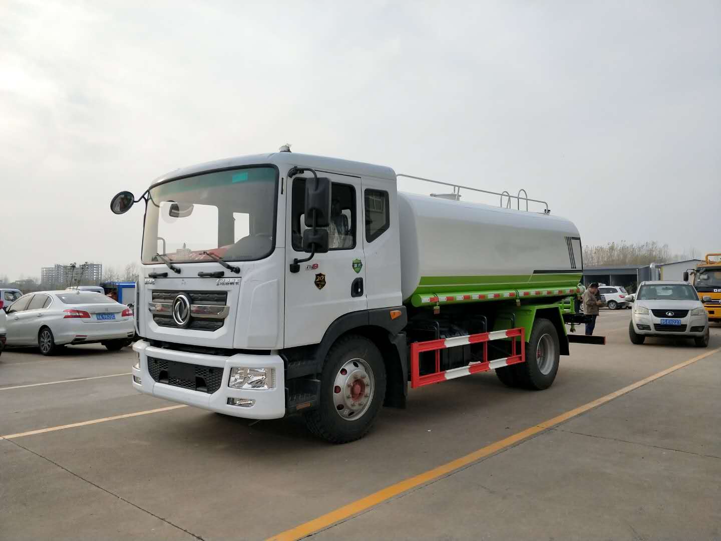 东风15吨洒水车其余标准配置为:前冲、后洒、侧喷、高位花洒、后工作平台、平台上安装360度可调节绿化水炮,带自流阀、滤网、消防接口(可连接消防栓取水,可作应急消防用),罐前量管(观察罐内水位)、罐后爬梯、罐上罐口、带简易护栏、罐侧双炮筒、炮筒内3米长钢丝塑胶抽水管两根,罐体表面双层油漆工艺,防锈、耐腐蚀,其余由厂家标配。