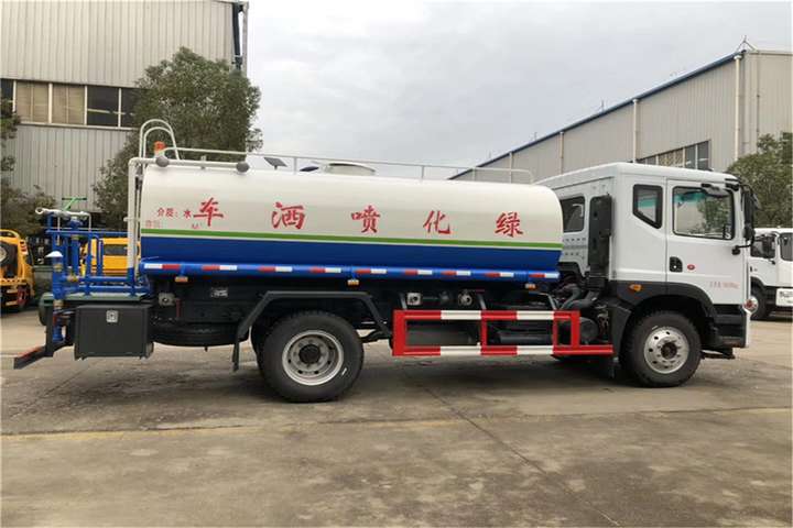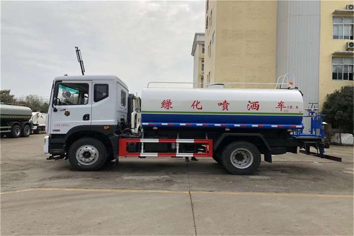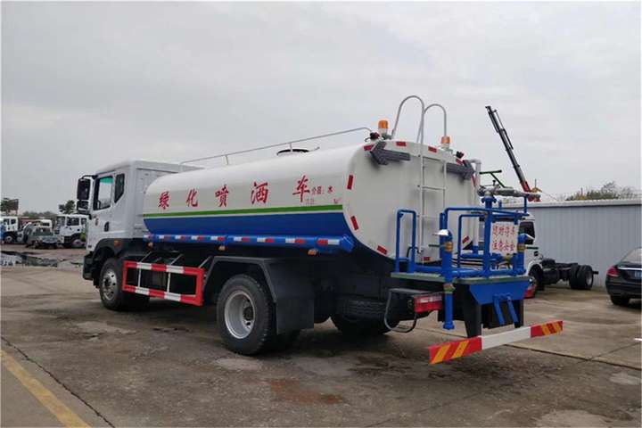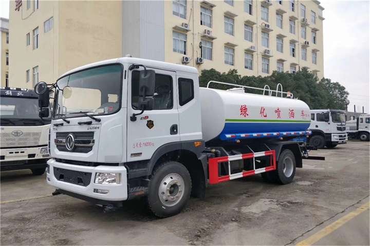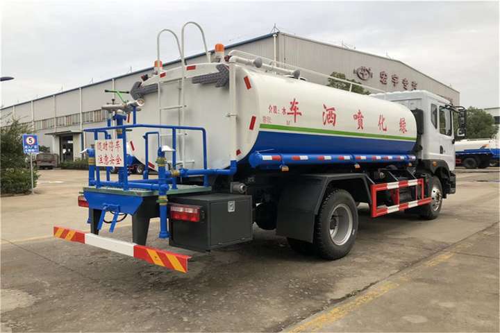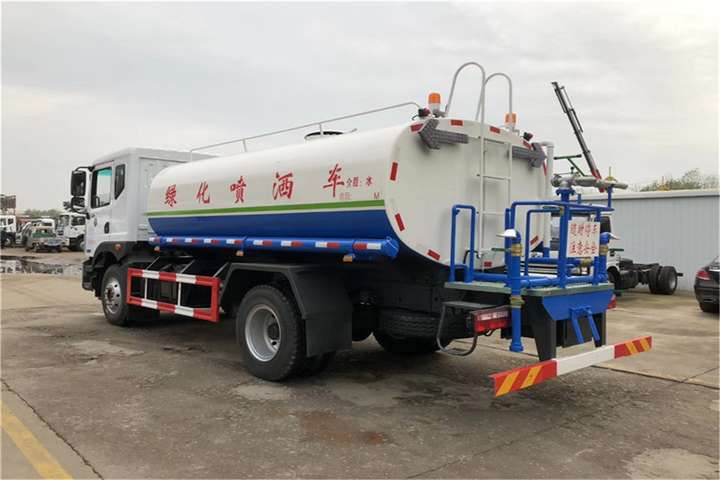 东风15吨洒水车其余标准配置为:前冲、后洒、侧喷、高位花洒、后工作平台、平台上安装360度可调节绿化水炮,带自流阀、滤网、消防接口(可连接消防栓取水,可作应急消防用),罐前量管(观察罐内水位)、罐后爬梯、罐上罐口、带简易护栏、罐侧双炮筒、炮筒内3米长钢丝塑胶抽水管两根,罐体表面双层油漆工艺,防锈、耐腐蚀,其余由厂家标配。