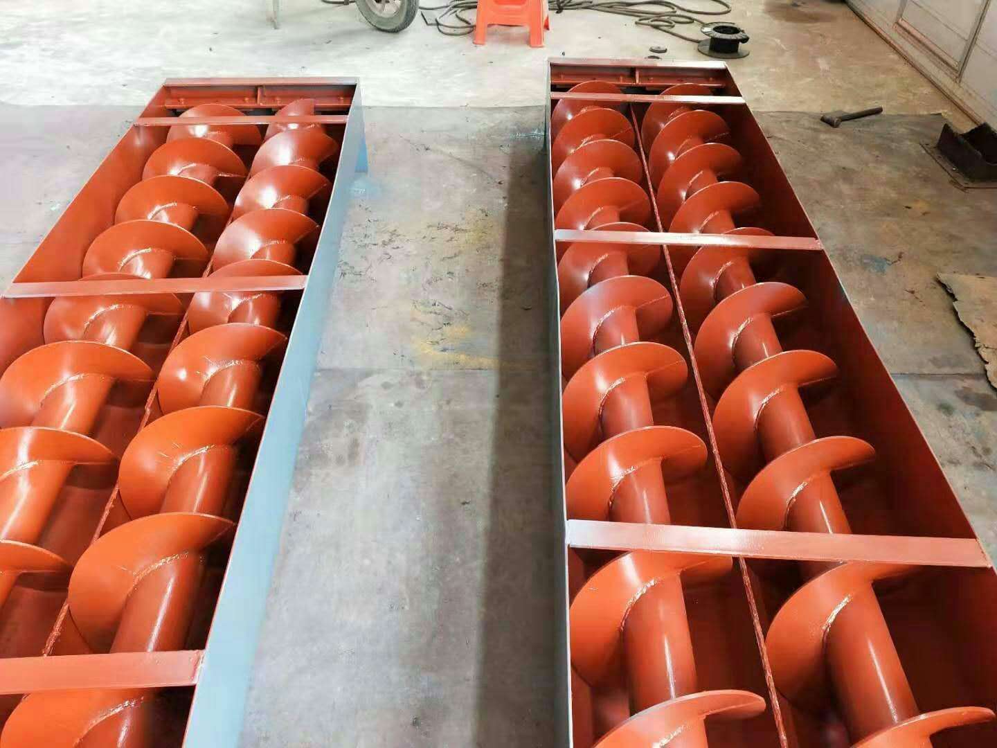 泊头洪捷双轴螺旋输送机其原理是在两条无缝钢管内分别装有一根实体螺旋,其中一根是左旋,另一根是右旋。工作时两根螺旋通过在轴伸位置的一对齿轮啮合转动,由于螺旋体的转动,使物料作轴向移动,从而达到输送目的。