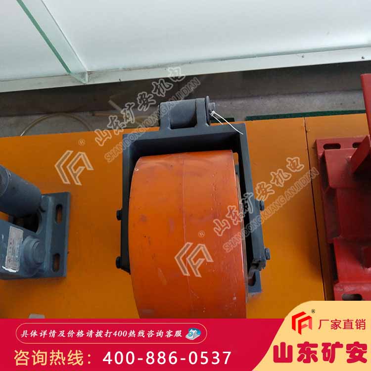 运转中由于滚轮的胶层被磨损,通过调节螺杆调节滚轮使滚轮前倾靠近罐道。调节螺杆一端为左旋螺纹另一端为右旋螺纹,分别拧入调节套和碟簧轴,调整时松开调节螺杆下边的螺母,逆时针转动调节螺杆,螺杆拧出,滚轮前倾靠近罐道,调好后紧固调节累杆下边的螺母。