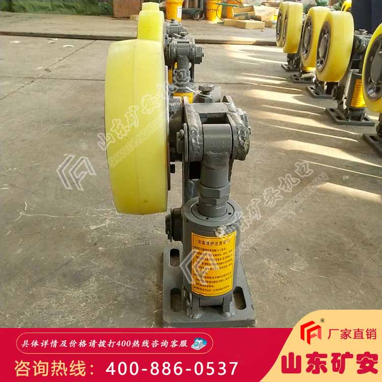 根据滚轮磨损情况,应对滚轮进行调整,方法是松开螺杆锁紧螺母,转动螺杆使滚轮靠向罐道,间隙0~2mm,调好后紧固锁紧螺母。kuangan002
