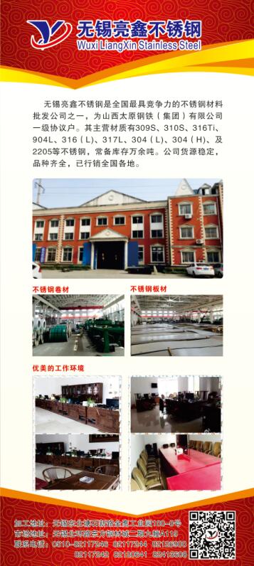 无锡亮鑫不锈钢公司是经营批发、零售太钢310S、309S、316L、321、304等各材质的不锈钢,主营310S、309S耐热不锈钢,是太钢的一级代理商,有着价格的绝对优势,量大价更优同时我公司也经营常规格的管材、棒材及非标定做,材质310S 309S 304 304L 321 316 316L同时也可根据客户的具体要求进行制造、切割及加工。我公司配有两个大型仓库,涉及开平 分条 水切割 激光切割 等离子机 磨砂机 压花机等一系列高端加工设备,满足国内各大行业客户的加工需求。