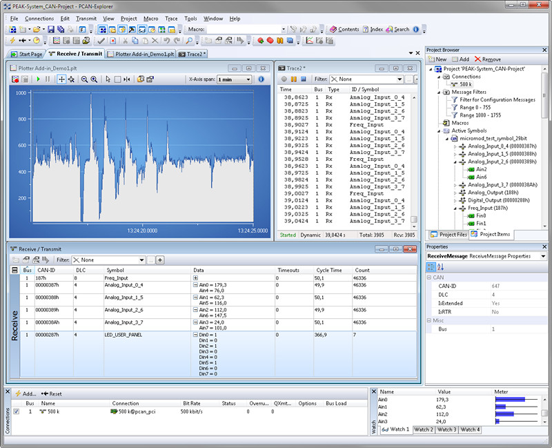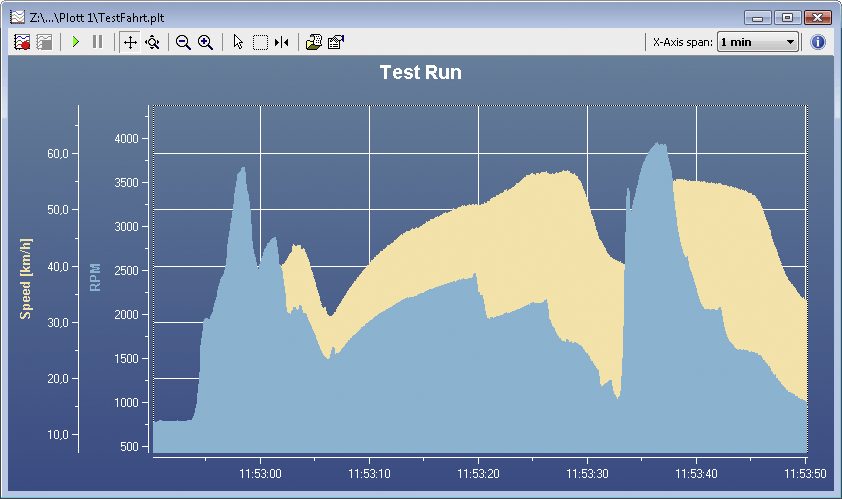 绘图仪插件可记录和图形化表现任何数量的信号序列。信号源可以是接收和发送的CAN报文,也可以是虚拟变量和宏计算的结果。