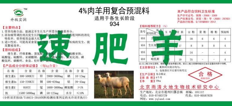 北京升牧实润公司肉羊用预混料产品是中国农业科学院饲料研究所借鉴国际最新研究成果,结合中国绵、山羊的品种特点和饲料特点,专门研制出的既能预防吃毛咬毛疾病、还能提高繁殖率和免疫力的肉羊专用复合预混料
