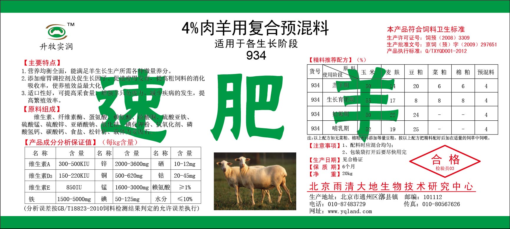 北京升牧实润公司肉羊用预混料产品是中国农业科学院饲料研究所借鉴国际最新研究成果,结合中国绵、山羊的品种特点和饲料特点,专门研制出的既能预防吃毛咬毛疾病、还能提高繁殖率和免疫力的肉羊专用复合预混料