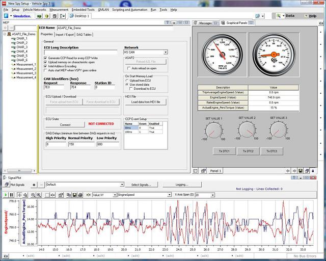 Vehicle Spy包含所有你需要的功能,你可以编辑你的ECU存储器,可用CAN标定协议(CCP),包括 ASAP2 (A2L)文件支持,以及存储器编辑控件来编辑数值,曲线和Map图。另外Vehicle Spy还包含一个完整的ASAP2文件生成器!