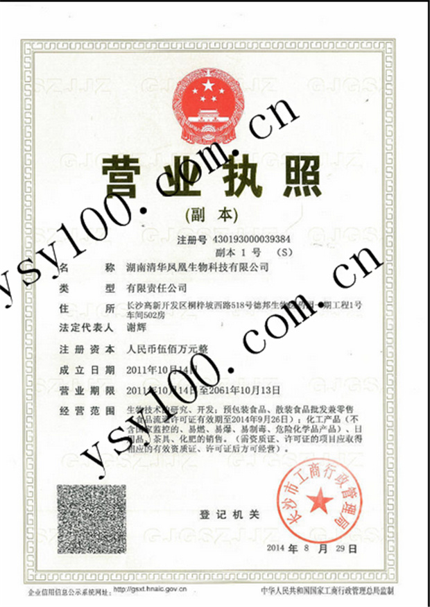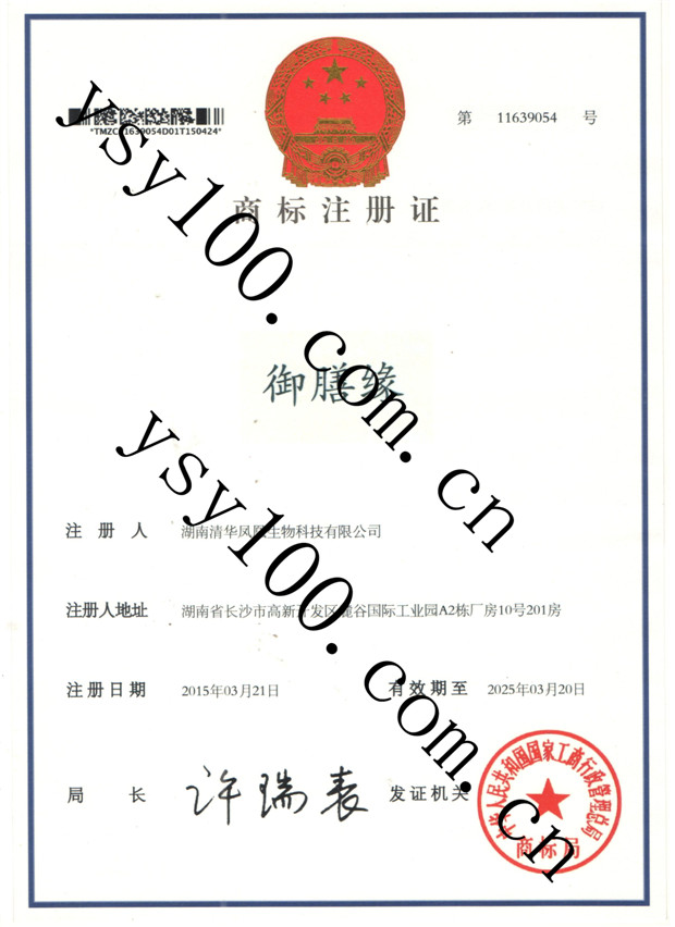 2、质疑御膳缘不是正规的品牌,特此申明御膳缘是率属于湖南清华凤凰生物科技有限公司,商标证如下: