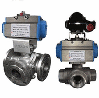 气动三通球阀分L型和T型,介质流通方向见下图。L型气动三通球阀适用于介质流向的切换,能使相互垂直的两个通道连通:T型气动三通球阀适用于介质的分流、合流或流向 切换,T型孔道可以使三个通道互相连通或使其中两个通道连通,气动三通内螺纹球阀一般采用两个阀座结构,亦可根据用户要求采用四阀座结构。