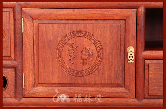 配寓意百子满堂的雕刻花纹。简 洁大方,高贵典雅。实木柜脚连接
