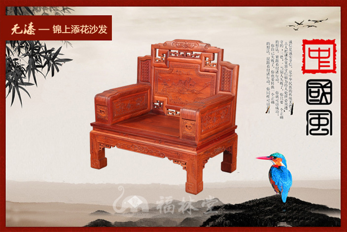 锦上添花寓意好上加好,为美好的生活增加色彩。沙发靠背写实性雕花,融合