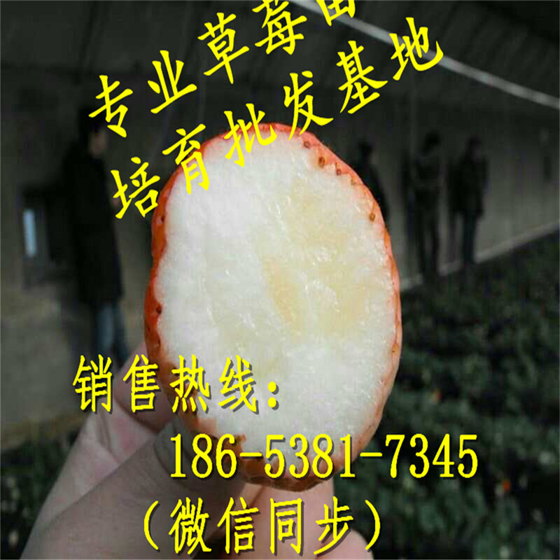 云南曲靖市草莓苗、种苗批发现挖苗圃 云南曲靖市草莓苗、种苗批发现挖苗圃---- [欢迎观看本基地网页,红颜草莓苗一亩地栽多少棵/购买优质红颜草莓苗,章姬草莓苗(甜宝,牛奶草莓)、香蕉草莓苗、甜查理草莓苗,白草莓苗,桃熏草莓苗,露天新明星草莓苗等,到【山东国迎草莓苗直销基地】,因为直销所以价格便宜,欢迎实地选购草莓苗,本基地随时欢迎各位新老客户实地参观考察,因为专业所任值得放心,基地电话:18653817345 或13793811946(吴经理)欢迎您 白草莓苗大棚优质首先品种 品种推荐:章姬草莓苗:(又名:甜宝) 章姬果实整齐呈长圆锥形,果实健壮,色泽鲜艳光亮,香气怡人。果肉淡红色、细嫩多汁、浓甜美味、回味无穷,在日本被誉为草莓中的,一级序果平均40克,大时重130克,适合在城市市郊游客下地自摘发展。章姬草莓苗植株长势强,中抗炭疽病和白粉病,丰产性好。 红颜草莓苗:果实圆锥形,种子黄而微绿,稍凹入果面,果肉橙红色,质密多汁,香味浓香,糖度高,风味,果皮红色,富有光泽,韧性强,果实硬度大,耐贮运, 该品种果个较大,大可达100多克,一般30至60克,硬度大于所有日本品种,果面红色、有光泽。果形果色明显优于丰香。该品种生长健壮,多级花序,结果期长,产量高,一般亩产3000至3500斤。红颜草莓的缺点是不抗白粉病,育苗不易,很容易几天内全军覆没。 在不使用化肥种植的前提下,如何保证种植的草莓营养不流失并且有效预防病虫害呢?声广健康陈晓讲述自身生物技术种植草莓,声广健康陈晓介绍,通过一种秸秆生物反应堆技术,生物反应堆由秸秆、辅料、菌种、植物疫苗、互换机、CO2微孔传输带等组成,将秸秆在专用微生物菌种的感化下,定向转化成植物生长所需的二氧化碳、热量、抗病微生物、有机质和矿质元素等,以秸秆代替化肥,以植物疫苗代替,让草莓达到优质、高产和无公害要求。 草莓苗种植技术、大棚管理方法任何问题都可来电免费咨询《13793811946》吴经理!!