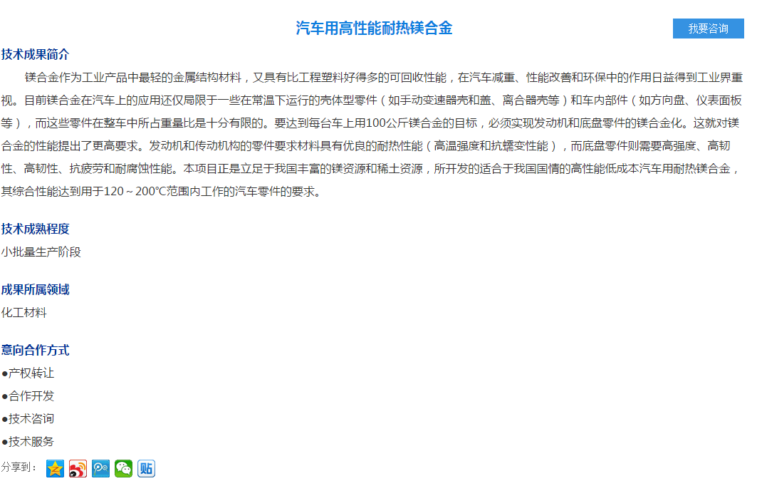 镁合金作为工业产品中最轻的金属结构材料,又具有比工程塑料好得多的可回收性能,在汽车减重、性能改善和环保中的作用日益得到工业界重视。目前镁合金在汽车上的应用还仅局限于一些在常温下运行的壳体型零件(如手动变速器壳和盖、离合器壳等)和车内部件(如方向盘、仪表面板等),而这些零件在整车中所占重量比是十分有限的。要达到每台车上用100公斤镁合金的目标,必须实现发动机和底盘零件的镁合金化。这就对镁合金的性能提出了更高要求。发动机和传动机构的零件要求材料具有优良的耐热性能(高温强度和抗蠕变性能),而底盘零件则需要高强度、高韧性、高韧性、抗疲劳和耐腐蚀性能。本项目正是立足于我国丰富的镁资源和稀土资源,所开发的适合于我国国情的高性能低成本汽车用耐热镁合金,其综合性能达到用于120~200℃范围内工作的汽车零件的要求。
