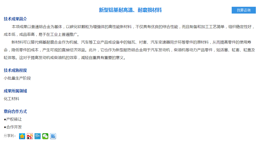 本项成果以普通铝合金为基体,以碳化钛颗粒为增强体的高性能新材料,不仅具有优良的综合性能,而且制备和加工工艺简单,组织稳定性好,成本低,成品率高,易于在工业上普遍推广。