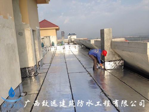 一般将聚氨酯防水涂料的甲料、乙料和稀释剂按重量1:2:3 的比例配合,搅拌均匀,再用长把滚刷蘸取这种混合料,均匀涂刷在干净、干燥的基层表面上,涂刷时不得漏刷,也不应有堆积现象,待基层处理剂固化干燥后才能铺贴卷材;也可以采用喷浆机压力喷涂含固量为40%、pH值为4、黏度为10cP的氯丁橡胶乳液处理基层,喷涂时要求厚薄均匀一致,并干燥12h时以上,方可铺贴卷材。