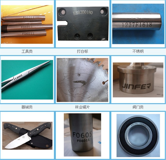金属打标机 标识机、金属打标记设备,清晰、耐久、不变色、不脱落、耐高温、不怕有机溶剂擦洗。不论产品大小、平面、弧面、薄片都能打印。打印精细,