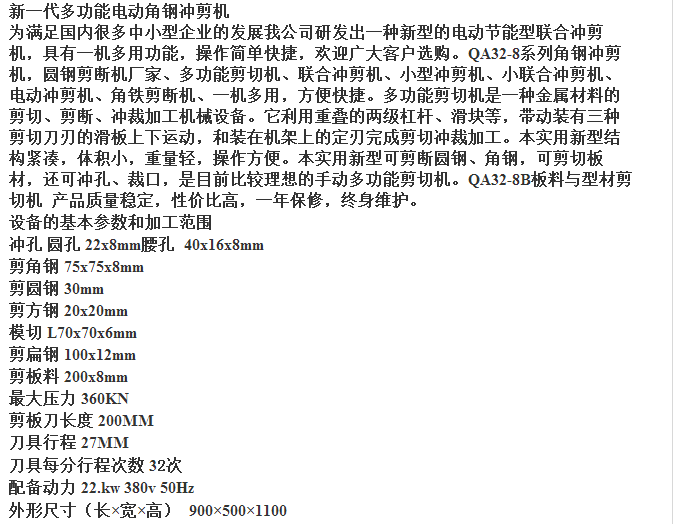 QA32-8B型多功能剪切机技术参数:1、 冲孔直径 22x8mm (腰孔40x16x8mm)2、 剪角钢 75x75x8mm3、