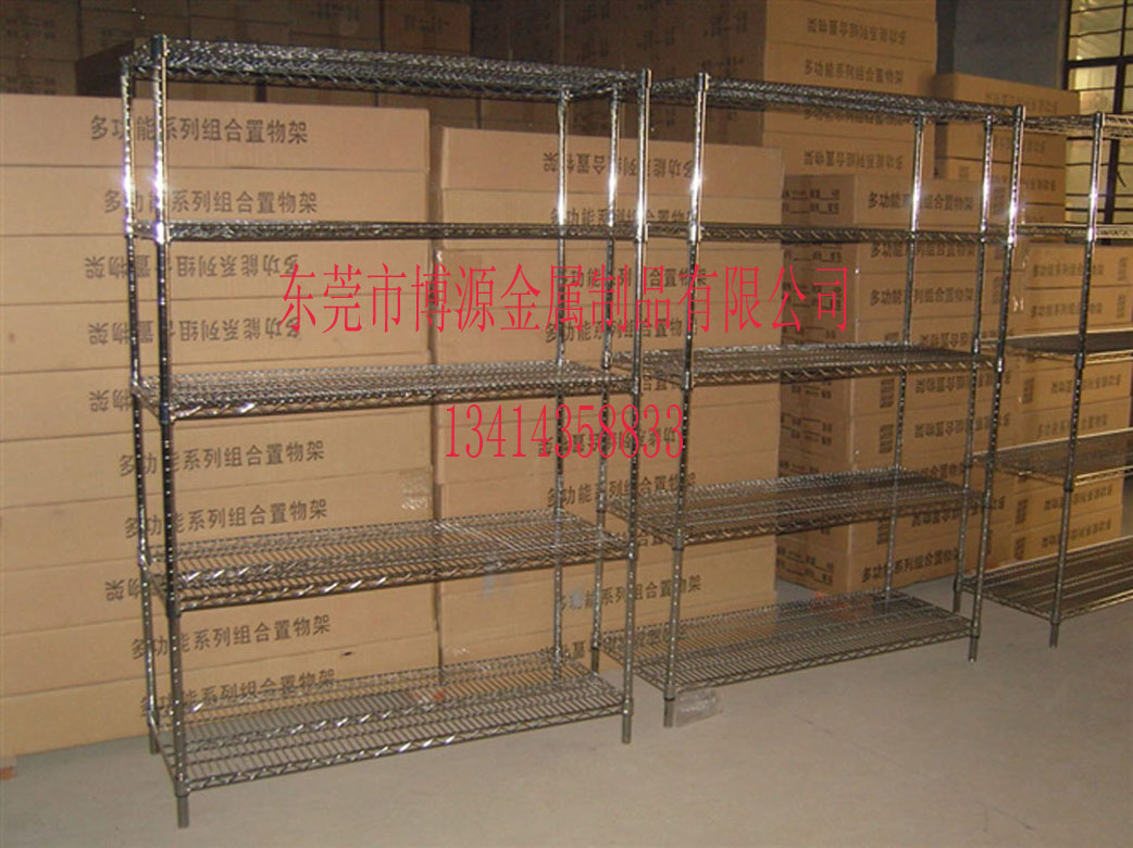 江苏镀铬置物架 采用碳钢镀铬网片及支柱组合而成,其独特的造型结构,设计灵巧,装卸简便,洁净亮丽,坚固的碳钢镀铬网片能促进空气流通,减少尘埃积聚,开放式的设计,令储物一眼可见。网片由主线6公里波浪线4.5公里,幅线30公里组合而成,支柱名叫竹节管,直径25.4mm,高度由600-2200mm任意选择。材质可选碳钢和不锈钢,每层的高度可以自由调教,支柱底部可加3寸.4寸.5寸轮子,可组合成餐车或手推车,适合用于工厂,酒店,家庭,商场等。