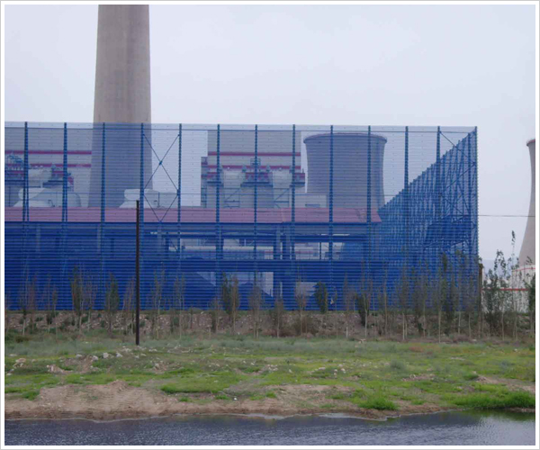 防风抑尘网是利用空气动力学原理,按照实施现场环境风洞实验结果加工成一定几何形状、开孔率和不同孔形组合挡风抑尘墙,使流通的空气(强风)从外通过墙体时,在墙体内侧形成上、下干扰的气流以达到外侧强风,内侧弱风,外侧小风,内侧无风的效果,从而防止粉尘的飞扬。