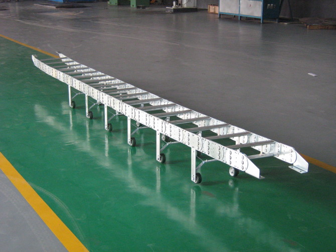 (3)单元链节由左右链板和上下盖板组成,拖链每节都能打开,装拆方便,不必穿线,打开盖板后即可把电缆、油管、气管、水管等放入拖链。