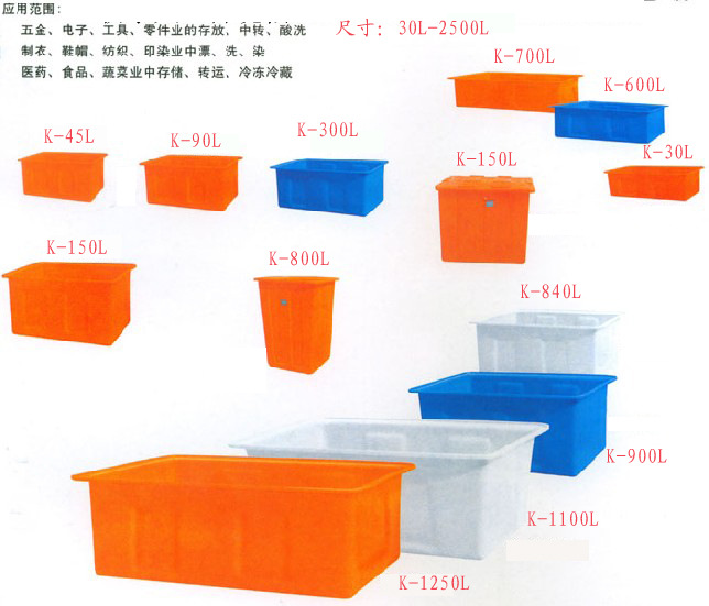 产品常用名称:PE方桶、塑料方水箱、PE桶、、塑料桶、周转桶、周转箱、布车桶内胆、塑料方桶、调浆桶、落纱桶、电镀酸洗桶。
