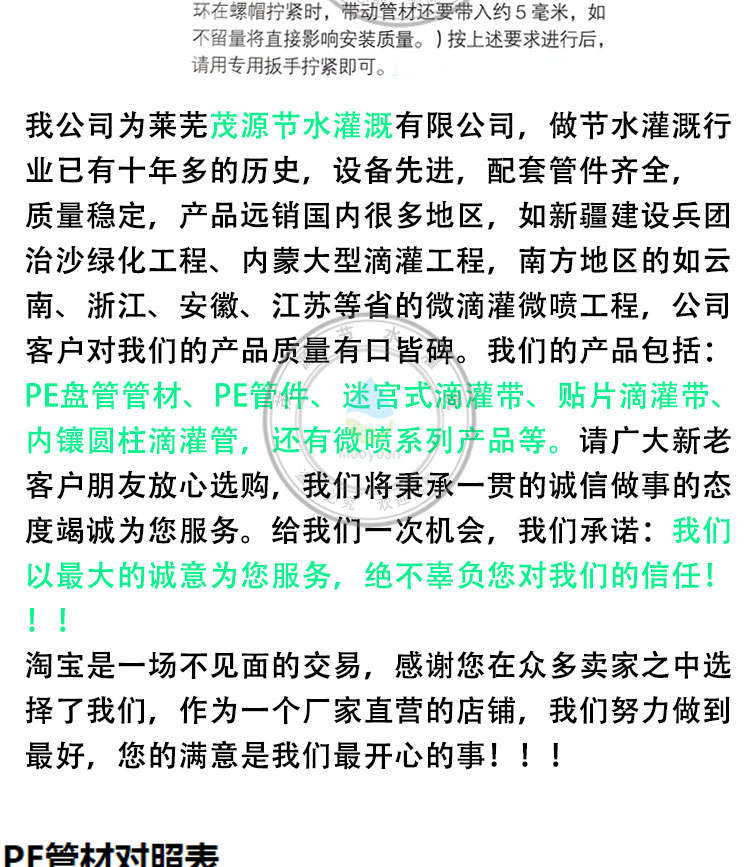 公司秉承“顾客至上,服务第一”的经营理念,坚持“客户第一”的原则为广大客户提供优质的服务。公司愿以先进的技术、优质的产品、优惠的价格、满意的服务,期待与您真诚合作,欢迎来我们公司实地考察洽谈业务,共创我国节水灌溉事业的美好未来!
