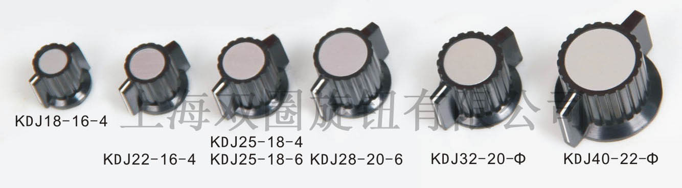 胶木旋钮KDJ系列,铜芯,上贴铝片,侧面用螺丝紧固。内孔有4MM和6MM。型号有KDJ18-16-4, KDJ22-16-4, KDJ25-18-6, KDJ28-20-6, KDJ32-20-6, KDJ40-22-6。