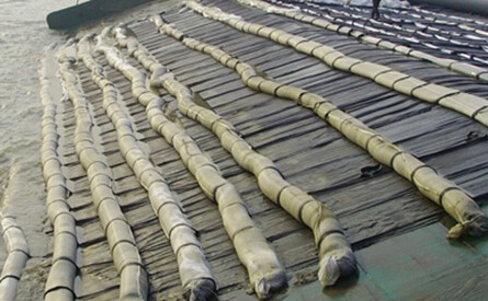 2.1 A型排:一侧为砂肋压载余排,另一侧为砼连锁块压载的余排,堤身为砂肋压载的混合式软体排。