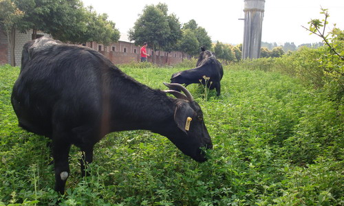 种草喂羊 可选用紫花苜蓿、饲用玉米、籽粒苋、三叶草、冬牧70黑麦草等。枯草期舍饲羊首选的多年生豆科植物紫花苜蓿,喜半干旱气候,抗旱性强,适于养殖山羊的山区。紫花苜蓿素以“牧草之王”著称,不仅产草量高,草质优良,而且富含蛋白质、维生素和无机盐,通常4—5公斤鲜草可晒制1公斤干草,也适宜打成苜蓿草粉制成颗粒饲料或配制全价料。需注意的是,羊耐粗饲,应与玉米秸秆等粗纤维含量高的粗饲料搭配饲喂。