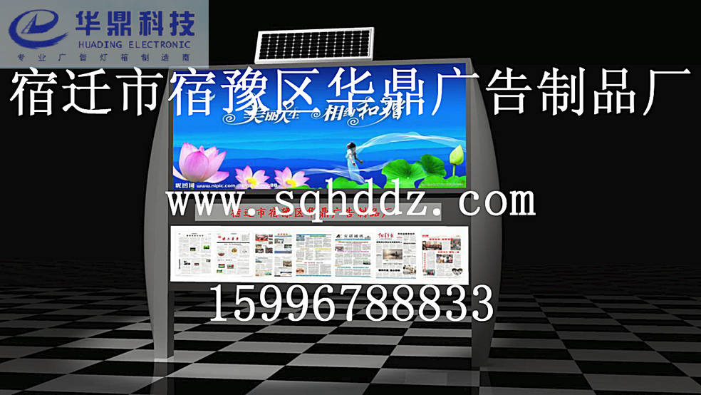 江苏省宿豫区华鼎广告设备厂位于宿迁市宿豫区顺河镇工业区,是国内生产智能滚动灯箱行业设计、生产最具规模的企业之一,公司拥有一流的设计能力和钢结构生产加工能力,现有生产面积10800平方米,拥有数控折弯机、数控剪板机、数控等离子切割机、数控冲床、喷塑流水线等加工设备,满足了不同的结构制作、不锈钢加工的需求,现拥有专业设计人员6名,员工50余人,已经形成以公交站台、候车亭,智能滚动灯箱为主的专业化生产规模,已经形成以指路牌灯箱、滚动灯箱、阅报栏和候车亭为系列的40余款产品。