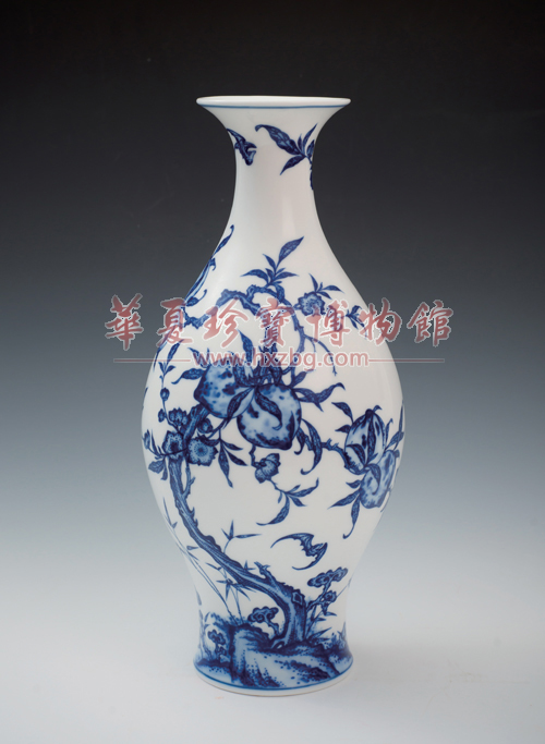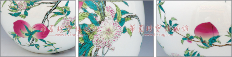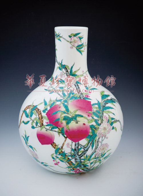 瓶口外撇,束颈,溜肩,弧腹渐收,足略外撇,呈橄榄形。腹绘一粗壮的桃树,结硕大的蟠桃八个,衬以桃花、竹叶、山石、灵芝纹、五只蝙蝠上下飞舞,寓意“五蝠捧寿”之意。