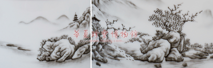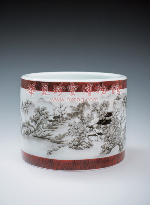 雍正皇帝不仅对瓷器品鉴要求极高,还创造出许多独特的瓷器品种,墨彩即是其中最有特色的原创之作,它采用国产彩料仿烧水墨珐琅的艺术效果,犹如在宣纸上以墨笔作画,木纹釉与墨彩结合,为世所珍罕。此器胎体洁白致密,纹饰构图疏密得体,层次分明,景物错落有致,颇得章法,笔触运用自然灵活,渲染皴擦,宛如一幅感染力极强的中国水墨画,格调清新,别具艺术魅力,是雍正时期少见的佳作。