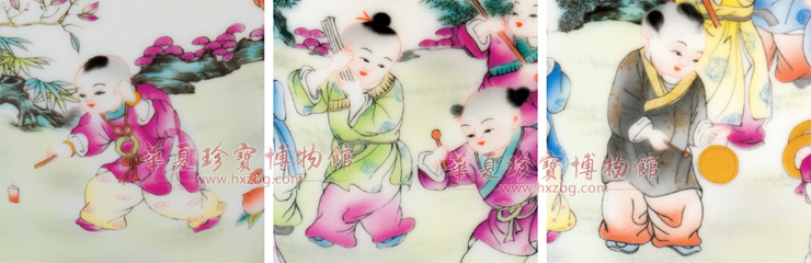 乾隆时期的婴戏图多出自供奉内廷的知名画家金廷标笔下。本作为金廷标早期作品,风格出于民间画法之上,画面用色明快,儿童姿态生动多样,动作夸张,由于彼时尚未受到乾隆个人好恶之影响,所以与乾隆朝中后期一贯的华丽与繁缛相比,艺术价值更高!是清代同类珐琅彩作品中最珍稀的一件作品!