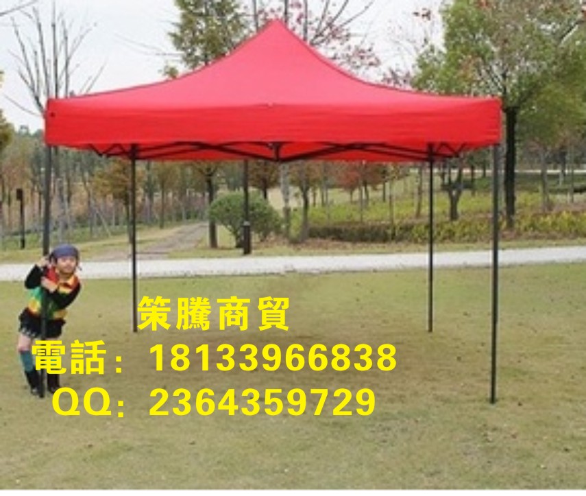 帐篷规格:2*2、2*3、3*3、3*4.5、3*6篷布上可以印刷任意图案和广告宣传标语, 帐篷的颜色有红、黄、蓝、绿,白,橙、枣红色、墨绿色等,篷布210d,420d,300d、600d牛津布,蓬面加有塑胶防水涂层,防紫外线,经防水抗老化处理之后经久耐用。3分钟内完成安装、轻巧耐用、携带方便,收放自如.伸缩支柱能任意调节帐篷高度,适合不同的环境和地形,简单稳固。帐篷支架是经氧化处理的铝合金方管或经烤白漆(或喷塑)处理的钢质方管加工而成。帐篷因为可折叠和轻便以及遮阳和广告面积都比较大的优点而被广泛应用于各种商业活动和非商业活动,其中产品促销更是不能缺少用帐篷,帐篷也被广泛应用于生活的的各个领域。