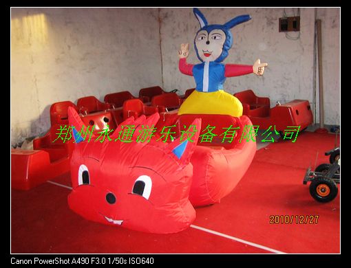 我厂生产的充气电瓶车分为单、双人两种型号,外壳采用高 光耐磨的工程塑料材质制成:单人充气电瓶车采用12V直流减速 电机;双人充气电瓶车采用24V直流减速电机:并设有快慢挡、 倒车、音乐等功能;配置MP3智能控制器,可计时、调速、音乐、 数字显示等等功能;轮胎为高效、高压耐磨型充气轮胎;底盘为 标准方钢结构,承重150KG以上;外罩采用PVC加厚牛津亮光布制成,具有耐磨、鲜艳、美观、易清洗、不退色等特点。我们可以 根据客户的要求定做各种款式,只要您能提供款式我们都可以根 据您的要求精确打板设计。 规格:(不含外罩) 单人充气电瓶车尺寸:长120cm 宽63cm高72cm 双人充气电瓶车尺寸:长120cm 宽93cm高72cm 二、永通配套设置 单人车:一块12V36A电瓶、50A充电器一个 双人车:两块12V36A电瓶串联成24V、50A充电器一个 三、设备保洁存放 1.做清洁处理,可使用洗衣粉将其污渍、油渍擦去,然后用 清水擦洗干净,晒凉干即可。 四、 操作说明: 1.将电源夹子分别夹在电瓶的正负极上(红色正极、蓝色负 极),确定夹子接正确之后检查风机位置、工作是否有异样。 确定风机工作正常后插入钥匙开启控制器。控制器开启后拔掉钥匙,控制器响起再踩脚踏开关。(注意:确认电源接正 确之后,再插入钥匙顺序不能颠倒。如果配置有遥控功能的: 需要先按A键启动,然后再按B键关闭才算完成一次操作) 2、电瓶的使用操作 因为电瓶车上配备的非干电瓶,客户 收到货后需要加入电瓶液才能使用。新电瓶加入电解液后即 有一定量的蓄电,先对加液后的新电瓶充满电后才能使用。 充电时打开电瓶上加液的螺帽再充12小时后电瓶液有连续的 气泡冒出证明电已经充好了。