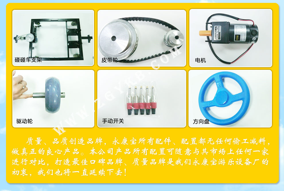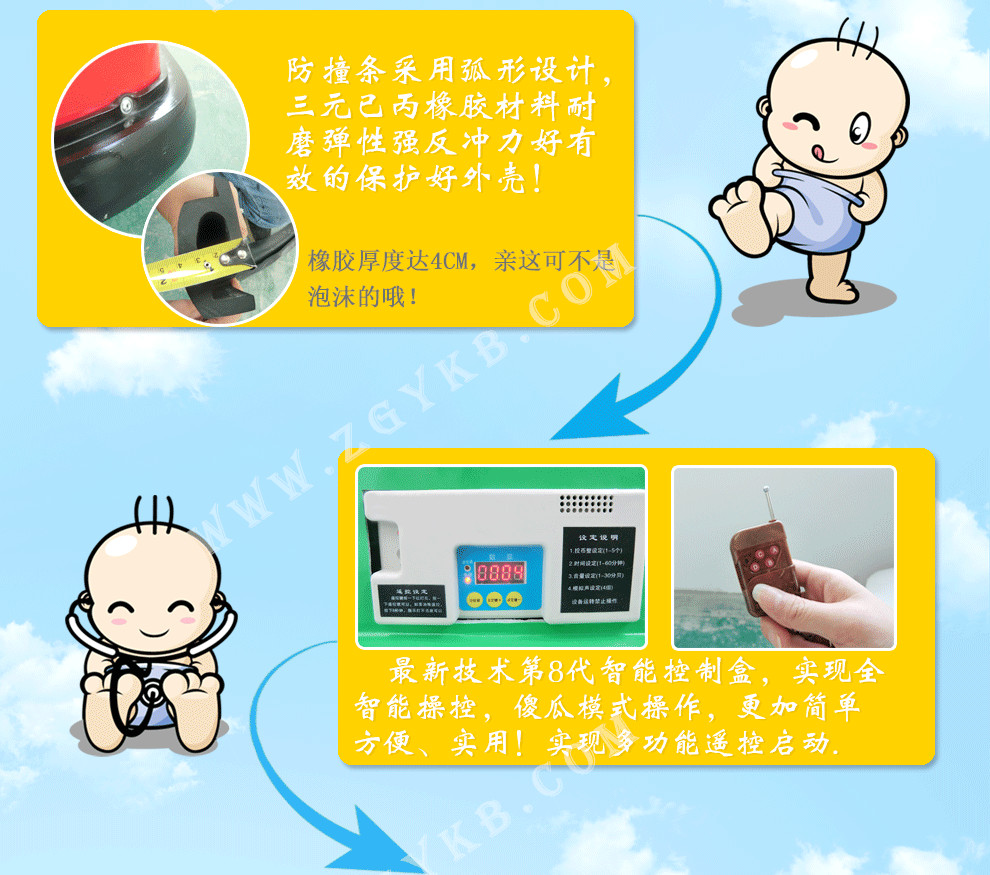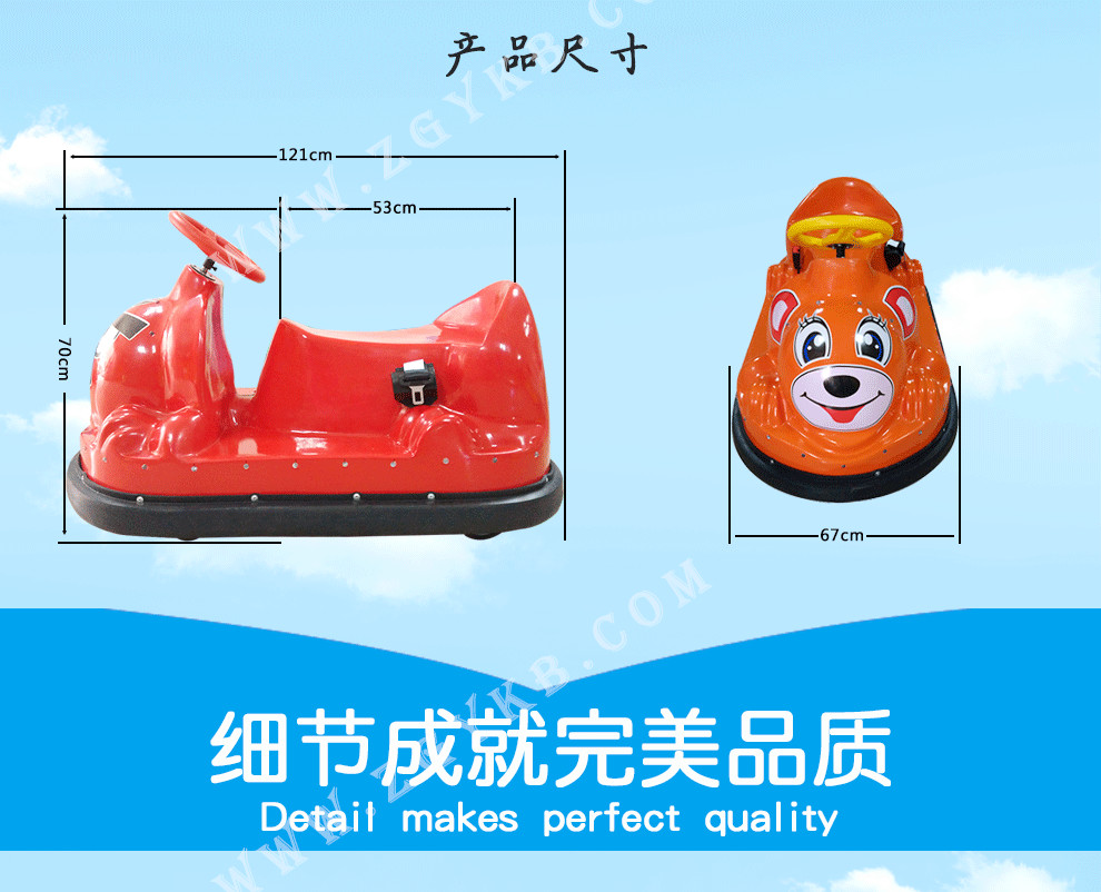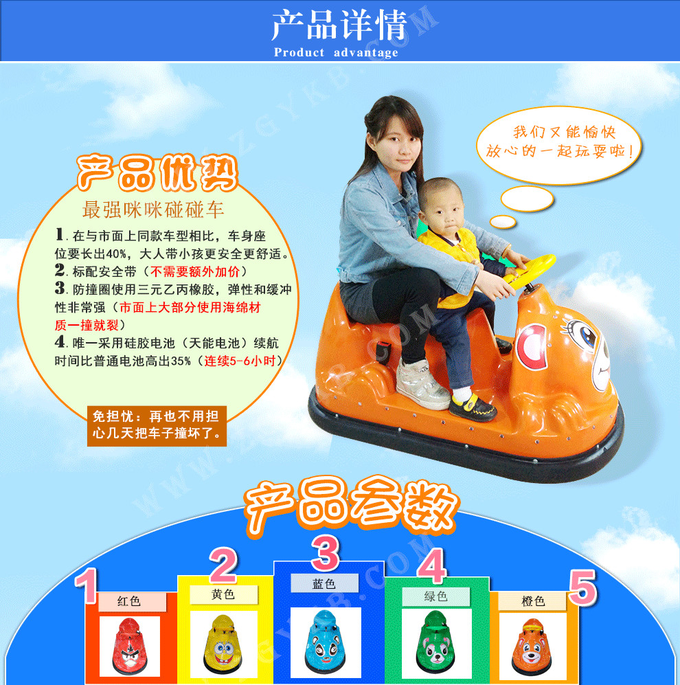 儿童咪咪碰碰车是一种碰碰车的升级产品。时而前进,时而后退,时而左转,时而右转。在能碰撞的基础上增加能左右一直旋转是该产品的一大亮点。带有MP3定时器,闪光灯,计数器,遥控器等功能。进口电机,可维护电瓶一次充电能连续适用5小时左右。