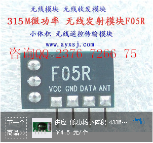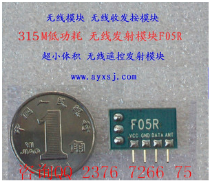 F05R是一款小体积、低功耗、低电压微功率发射模块 ,ASK方式调制,采用SMT生产工艺,声表谐振器稳频并符合FCC认证标准。 特别适合短距离无线遥控报警及单片机数据传输。性能和引脚与F05V完全相同,可直接替换,成本低于F05V。
