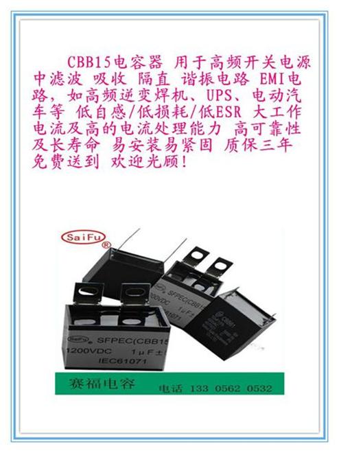 特点:赛福电容CBB系列产品防爆 防锈 灌注蓖麻油 。广泛应用于空调、冰箱、洗衣机、风扇、电机、机械水泵、灯具,电动工具、电力电网、自动化工程等. 种类有滤波,脉冲,储能,逆变,油浸,防爆,。