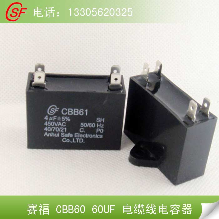 本公司专业生产“赛福”牌CBB65、CBB61、CBB60系列电容器。即为空调、洗衣机等电机配套的电容器。额定电压450VAC,容量1-100UF之间。