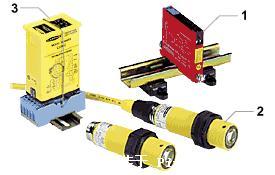 中型光电传感器是长方形或圆筒形。对照式感测距离可达60公尺. 尺寸范围从42x42x12.7mm 到102x30.7x12.2mm 为长方形,102x30mm 为圆筒形