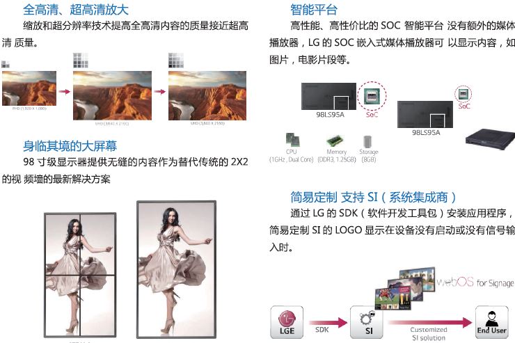 北京景圣东方科技有限公司拥有先进的技术设备、高素质的熟练技工;严格按照ISO9002国标质量体系标准。集研发、设计、制造、销售、服务为一体;以专业精神和不断更新观念,来引领市场新潮流。产品详细说明:JS-PL系列84英寸、98英寸 4K超清分辨率,采用原装LG8498寸工业级液晶面板,支持IPS技术具备超高可视角度,是一款具备M-TOUCH触摸功能,LED背光的商用触摸显示器。设备采用了超薄超窄边设计,提供宽视角、4K超高分辨率的优秀画质。它不但提供了卓越的显示效果,并且将触摸控制与显示完美结合,形成了一整套专业、工程、商用等领域的触摸显示一体化解决方案;JS-PL844KL 以多功能,坚固耐用,易维护,易安装等产品特色,为专业显示项目中提供了良好的设备稳定性、易用性、兼容性;超高分辨率大尺寸触摸显示器不仅客户给顾客带来更强的视觉冲击同时,也给客户带来前所未有的触控体验。产品可广泛应用于各种商用场合, 如零售,自助服务,酒店业,交通运输,教育和医疗等领域。相关资料:产品名称:超清商用显示器;产品类别:显示器;