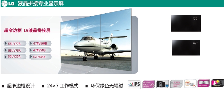 景圣科技特推出LG原装液晶拼接屏,LG原装液晶拼接屏是公司倾情打造,LG原装47英寸、55英寸超窄边液晶拼接单元、主要应用于大型液晶拼接系统,通过专业级超窄边液晶拼接单元以M×N阵列排列进行拼接的整套液晶墙大屏幕显示系统;其中超窄边液晶拼接单元属于专业级工业级液晶显示器,具有先进的超窄边液晶封装技术,属于完整的成品显示器,即挂即用,在量身定制的安装支架上安装就像搭积木一样简单,单个或多个液晶拼接的使用及安装都非常简单; LG原装液晶拼接单元提供最低3.5mm拼缝,500-700nit亮度,分辨率可达1920×1080 FHD标准,专业超窄边液晶拼接大屏幕系统,画面宏大、视觉冲击强烈,具有很好的展览、演示、广告、宣传的效果。并且具有安装简便、不受空间限制、系统稳定性高、系统兼容性强、系统操作简易等特点,应用领域广泛应用于:电力生产调度控制中心,监控中心、 军事指挥控制中心, 城市管理应急指挥中心, 交通管理指挥中心, 工业流程控制显示系统, 广播电视显示及监控系统, 商场、酒店、通讯信息显示系统, 金融证券信息显示系统, 政府企业多媒体视频会议显示系统, 矿业安全生产监控系统, 城市环境监控指挥系统, 消防、气象、海事防汛指挥系统, 机场、地铁航班显示、行李、安全监控系统, 剧院、媒体广告、展览显示系统, 品牌专卖店形象展示系统, 演唱会,显示设备租赁等;。以上内容只是LG原装液晶拼接屏的部分信息,想要了解全部信息,或寻找更多的超窄边液晶拼接,请来电咨询或登录公司官网。