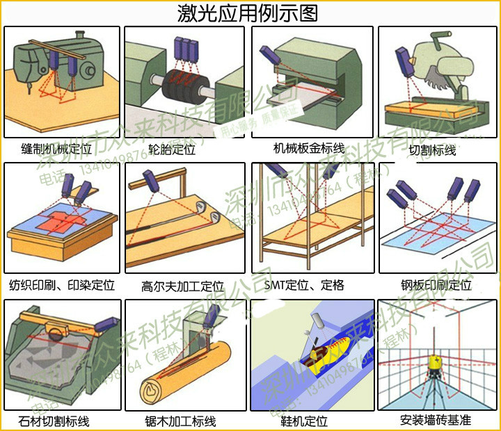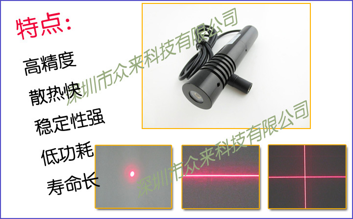 定位仪、测距仪、测温仪、激光标线仪(投线仪)、各种板材切割成型机、石材机械、木工机械、金属锯床、包装机械的对刀、放线、服装类(缝纫机、裁剪机、自动手动断布机、开袋机、套结机、拉布机、绣花机、印花机、钉珠机、钉扣机、铆钉机、啤机)、电子工量具、鼠标、U盘、摄像机、手机、投影教学翻页笔、激光笔、工艺品、室内外装饰、手电筒、礼品类、玩具类等产品中。方便快捷、直观实用、易于安装、稳定可靠。能较大幅度的提高工作效率。