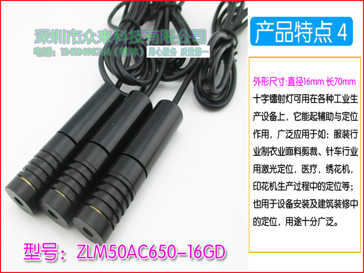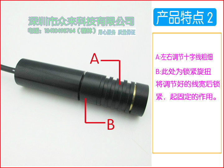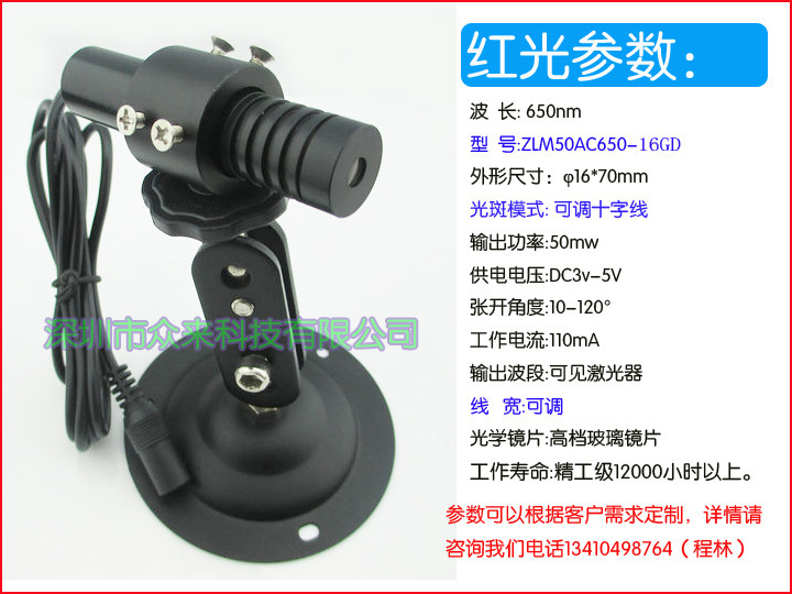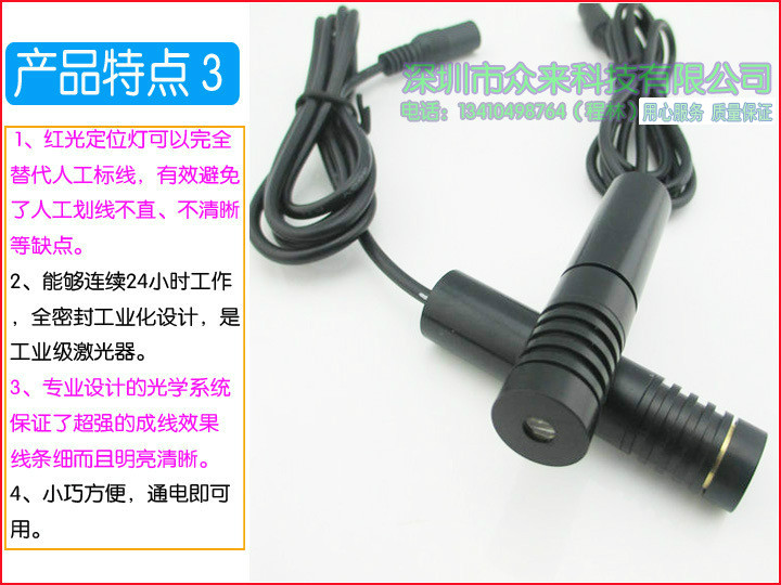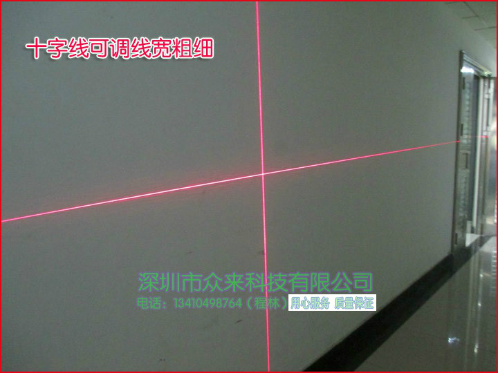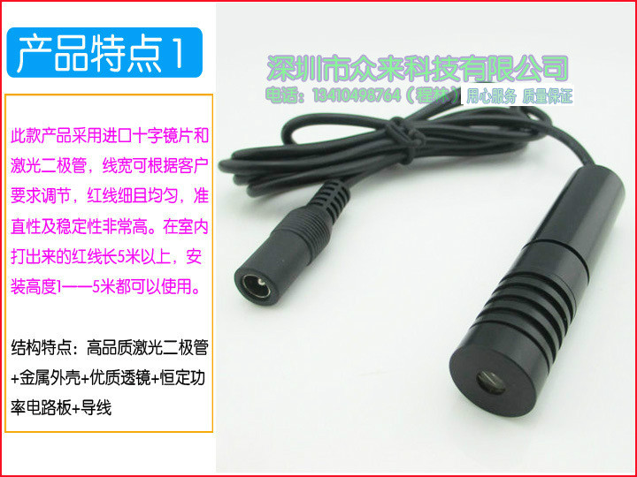 该款产品采用进口圆柱形玻璃十字镜片和激光二极管,十字线线宽可调,外式调节,简单、方便、散热快,寿命长。红线细且均匀,准直性及稳定性非常高。出光口处加了玻璃窗,可防尘。在室内(非太阳下)打出来的红线长5米以上,安装高度1米——5米都可以使用。