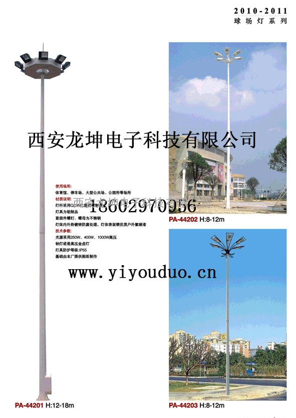球场灯—特点:造型美观,具有很强的装饰性。照明面积大, 照明效果好,光源集中,光照均匀,眩光小,易于控制、维修。电动升降操作方便,灯盘升至工作位置后,能将灯盘自动脱、挂钩、钢丝绳卸荷。照明控制分有手控、光控、时间控制和微电脑控制。