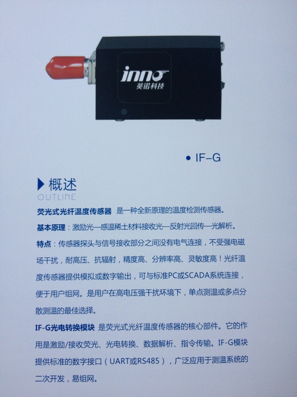IF-G光电转换模块 是荧光式光纤温度传感器的核心部件。它的作用是激励/接收荧光、光电、光电转换、数据解析、指令传输。IF-G模块提供标准的数字接口(UART或RS485),广泛应用于测温系统的二次开发,易组网。