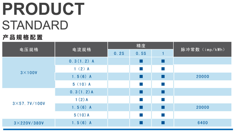 电流规格:互感器接入式:0.3(1.2)A,1(2)A,1.5(6)A,3(6)A , 5(6)A