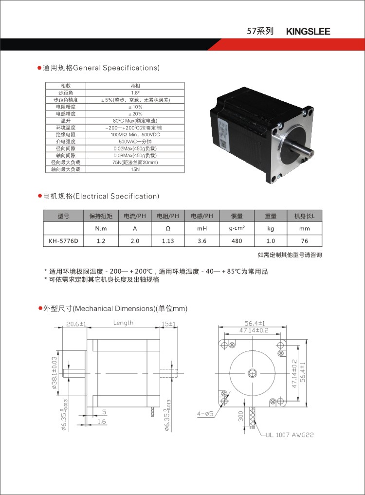 2, 标准设计42、57、86框号两相四线制混合式步进电机,还可依需要订制其它规格马达,或定制出轴形式等。
